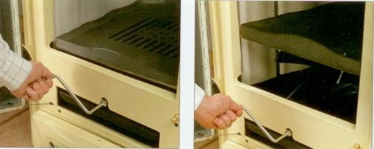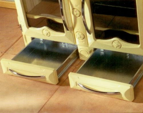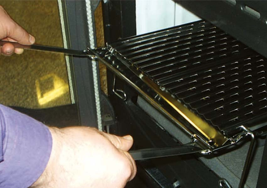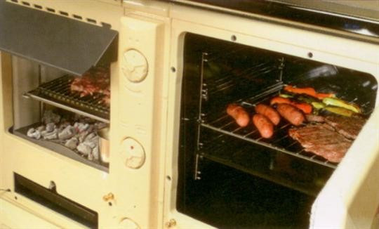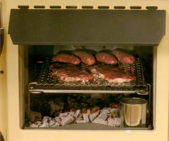 Levá strana sporáku slouží k přikládání dřeva. Navíc tato část byla rozšířena o možnost grilování. Speciálně navržena stříška přitom brání kouři, aby unikal do místnosti během otevřených dvířek.