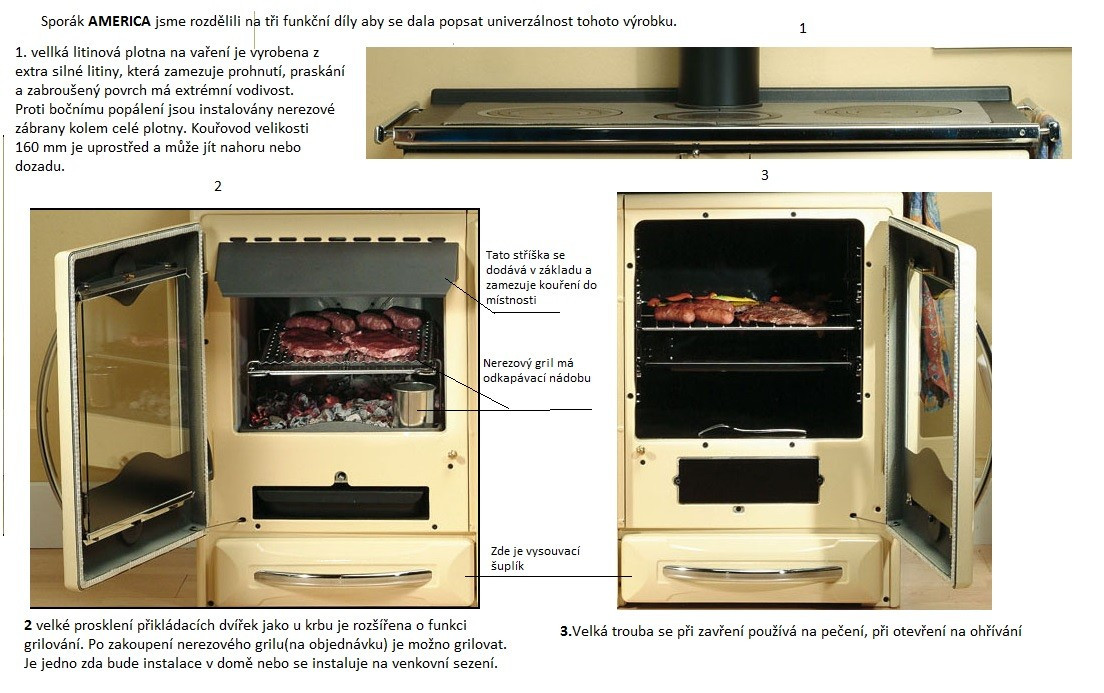 Sporák America kombinuje hned několik věcí dohromady. Krb, grilování, pečení v toubě, vaření - vše v jednom a do detajlu propracované. Stačí už jenom přistavit ke komínu a hned můžete využívat komfortně všechny funkce.