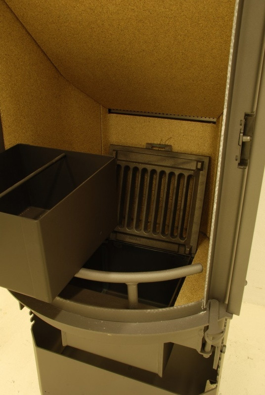 Pod spalovací komorou je popelník o objemu 8 litrů čistitelný z prostoru spalovací komory například krbovým vysavačem jako u krbových vložek s obestavbou.