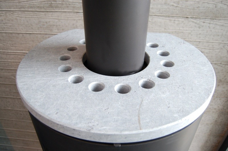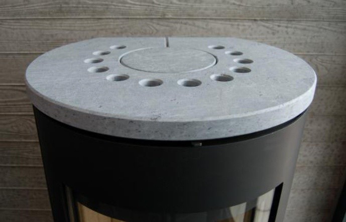 Na horní část krbových kamen je možné pořídit kamennou mastkovou desku. Tyto světlé kameny tvoří krásný kontrast s černým pláštěm kamen.