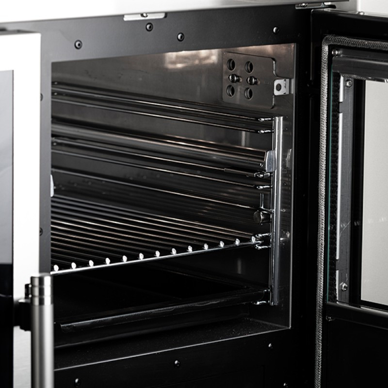 Sporák na dřevo S80 má velmi moderní design a vyniká velkými prosklenými dvířky topeniště a stejně tak velkými prosklenými dvířky pečící trouby. Je vybavena špičkovou technologií, která zaručuje krásné hoření, efektivní spalování a nízké emise.