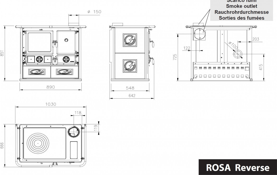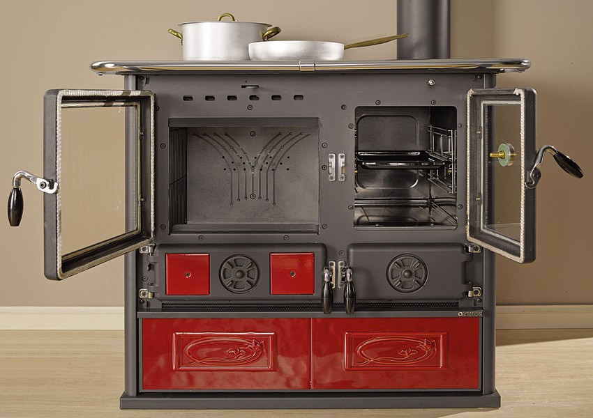 Přepínací klapka na výstupu kouře s kamen umožňuje vyřadit z provozu troubu (např. v létě) a tím používat sporák jen na vaření s menším vyzařováním tepla. Dvířka pod ohništěm se používají na popelník, stejná dvířka vedle ukrývají prázdný prostor na ohřívání nebo sušení. Úplně dole je velký vysouvací šuplík, který se používá jako zásobník dřeva. Výstup a napojení na komín je vždy na pravé straně nahoře a může být upraven také dozadu. Ovládací kličky mají izolovaná držadla, která snižují popálení, chromovaný rám kolem dokola chrání proti spálení od okrajů plotny.