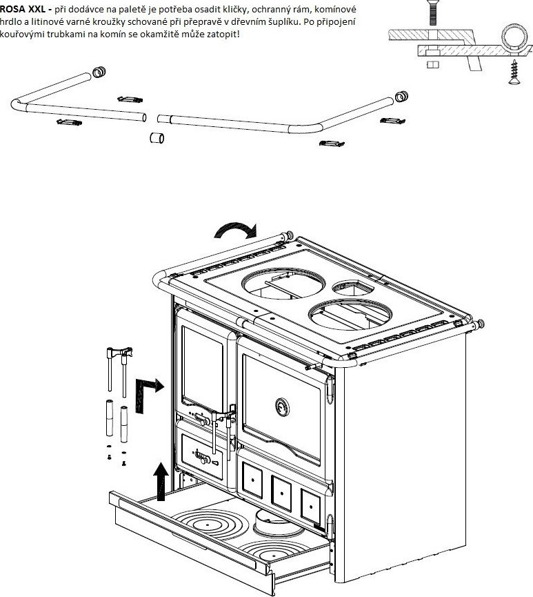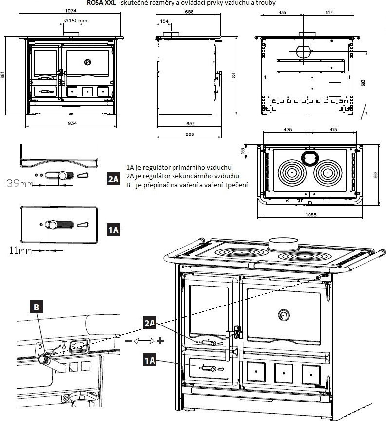 Rosa XXL zvládá jak topit, tak vařit či péct. Dvojité zasklení spalovací komory zamezí nežádoucímu teplu při vaření, královská velikost trouby a teploměr uvnitř, umožňuje péct jako v klasické troubě. Zabroušená litinová plotna vede teplo jak na plynu. Spodní vyztužení zamezuje prohnutí a prasknutí, vývod kouře uprostřed umožňuje připojení na komín z leva i z prava. Litinová přední dvířka nemění tvar ať jsou studená nebo horká, vždy dokonale těsní. Otvírací kličky jsou potažené teflonem, takže nepálí. Boční kryty mají vzduchové průduchy pro konvekční ohřev vzduchu, Chromované madlo kolem celé plotny zamezuje nechtěné popálení. Spalovací proces hoření dřeva probíhá ve třech fázích a proto je malá spotřeba, s produkcí maximálního zhodnocení na vaření, pečení ale také vytopení prostoru. Všechny kovové části jsou chráněny proti propálení a reznutí vypalovaným skleněným smaltem, přepínací klapka a ochraný kryt trouby je z nerez oceli.