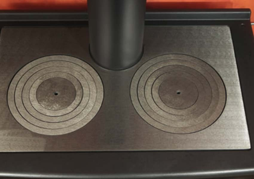 Horní litinová plotna je zesílená ze spodními výstuhami, vrchní strana je pro lepší převod tepla zabroušená a nad topeništěm ještě složená ze šesti litinových kruhů. Tato konstrukce zcela vylučuje průhyb a praskání. Výstup kouře je vyřešen uprostřed o velikosti 150 mm a může být také dozadu.