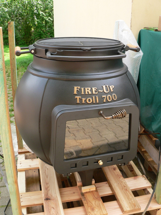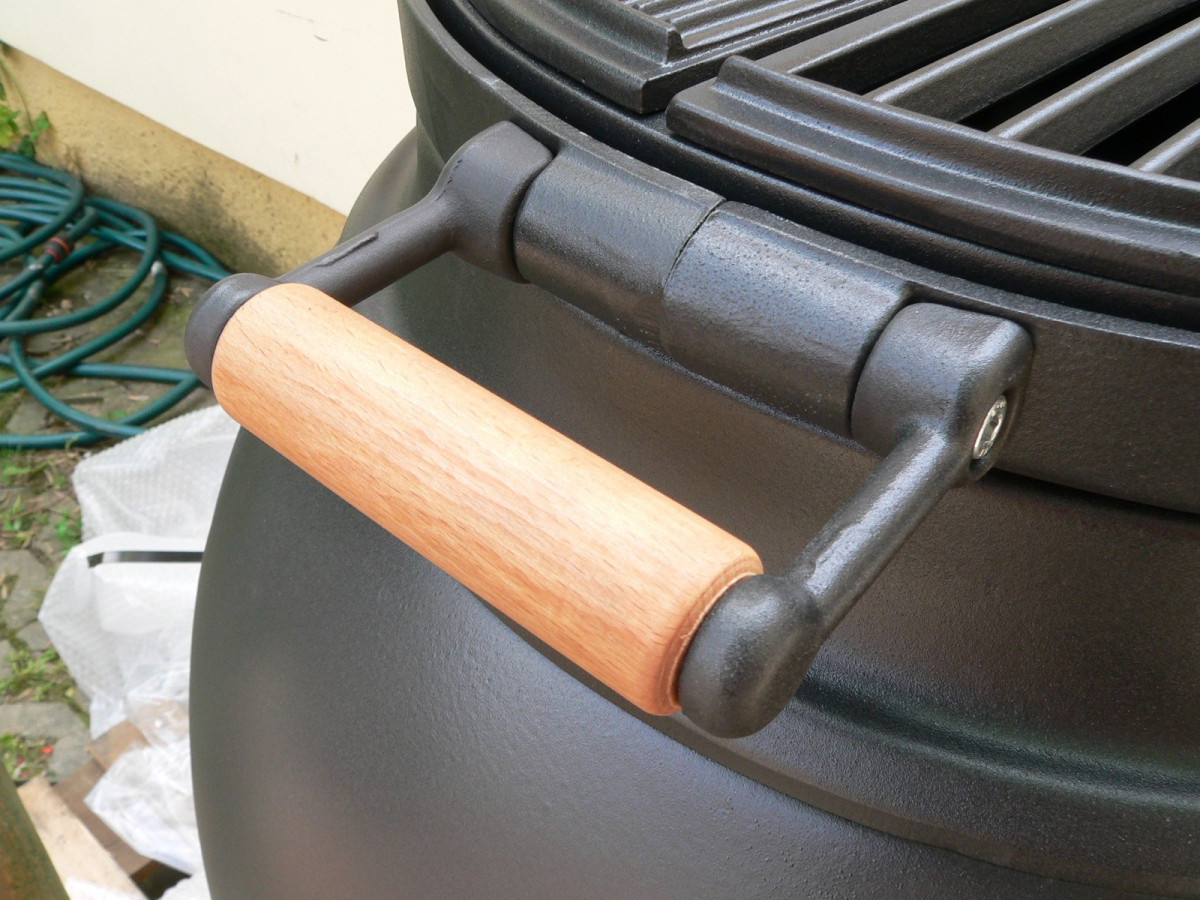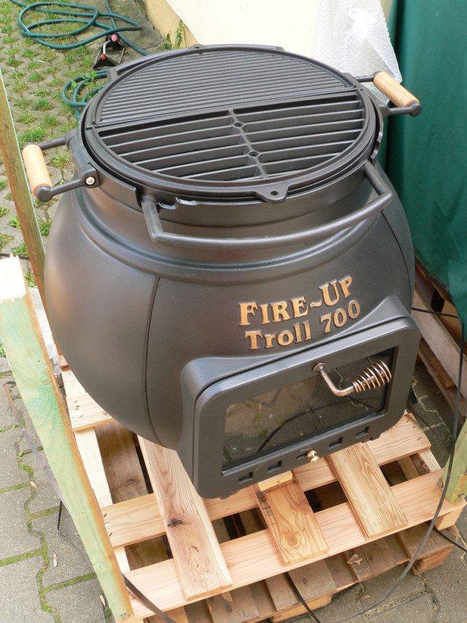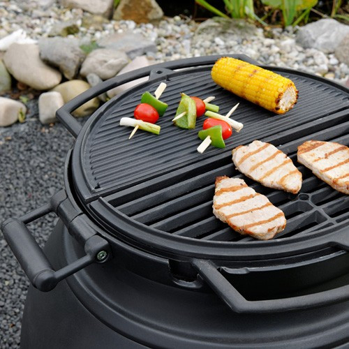 Je litinový (smaltovaný) venkovní, multifunkční, mobilní krb / gril / udírna / ohniště.